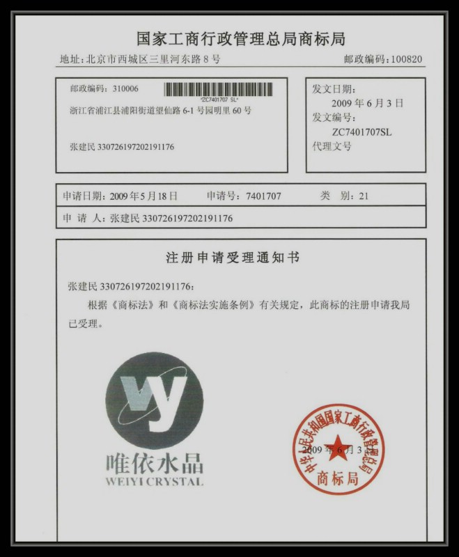 浦江唯依水晶工艺品厂的注册商标已经正式受理