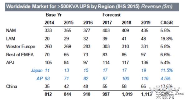 由于当前的云计算、大数据等技术趋势呈现爆发性增长,***中大功率UPS市场得以快速发展,如图,根据IHS 2015的分析报告显示,近几年和未来三年>500 KVA的UPS市场增速基本达到两位数以上,中国的平均增长可达13.6%。